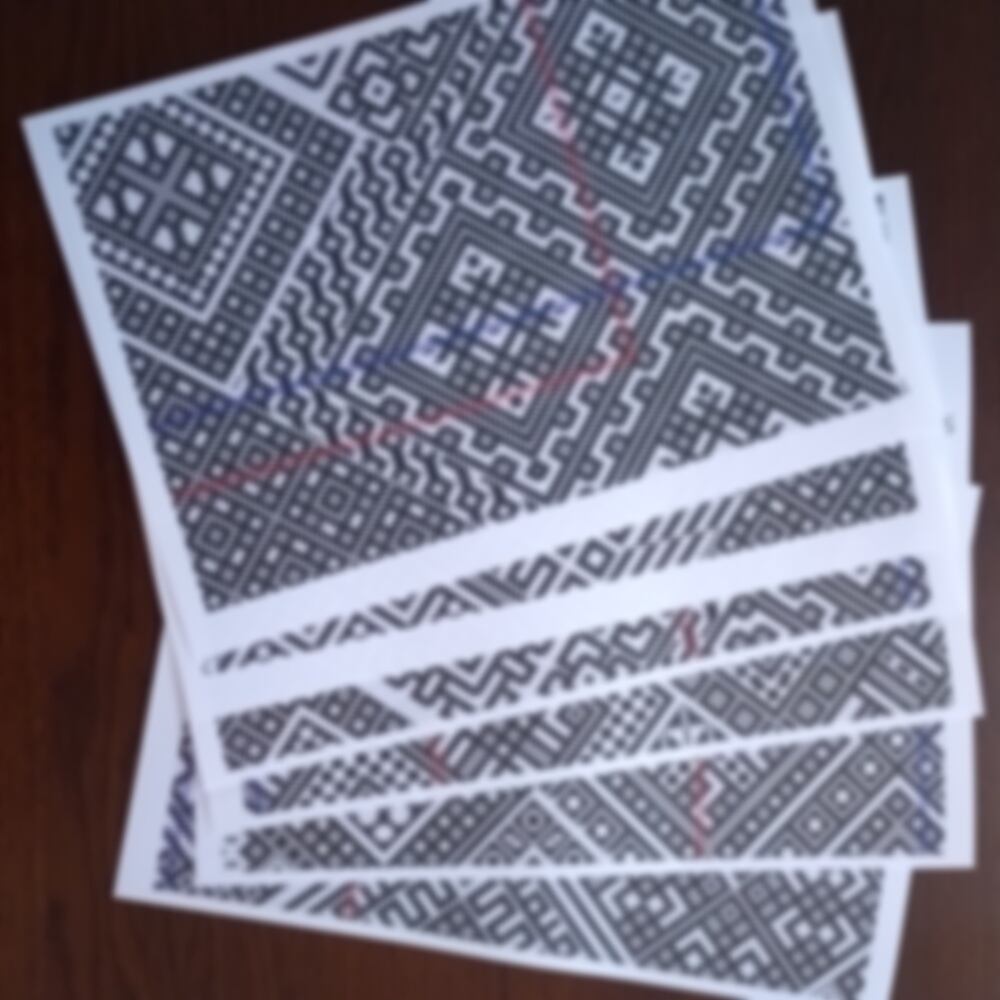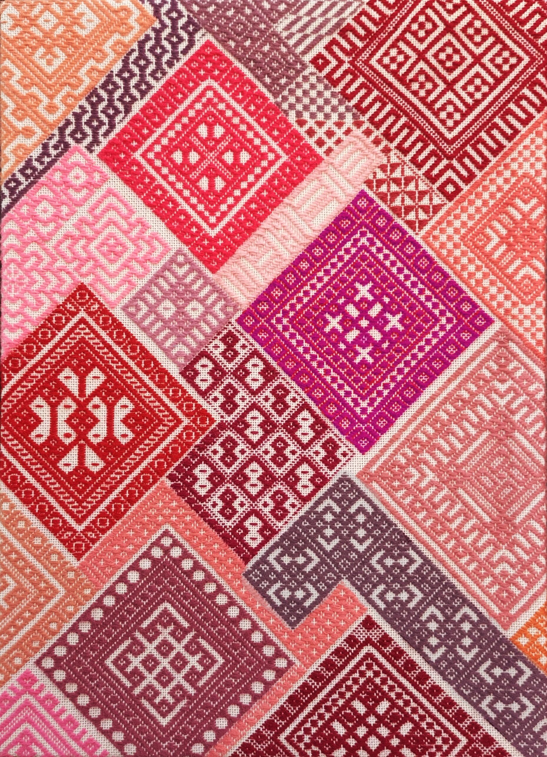 暖色系の糸21色で21ブロック(24柄)に分けた単独柄と連続柄。ブルー版では菱形の大きい単独柄は2箇所のみでしたが、今回はたくさん入れたことで、伝統的な風合いと現代的なデザインが融合した図案となっています。