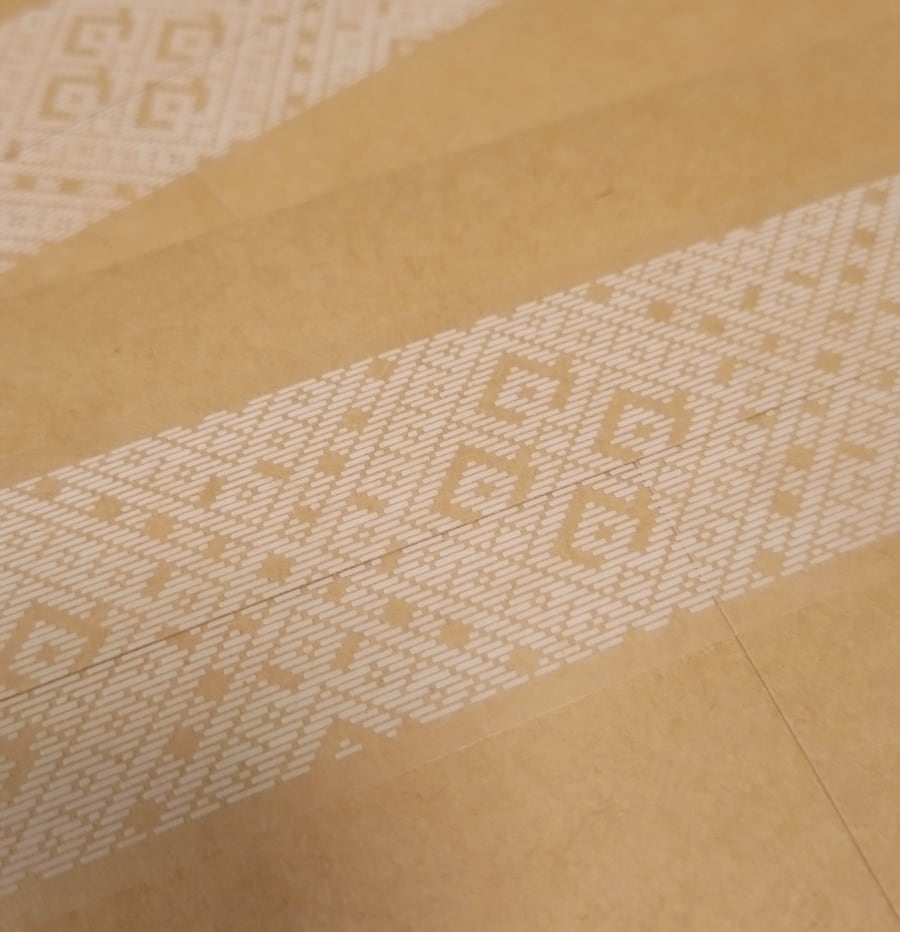 透明テープに白色印刷のデザインなので、カラーのものに貼ると未晒しの糸で刺したように見える配色になっております。